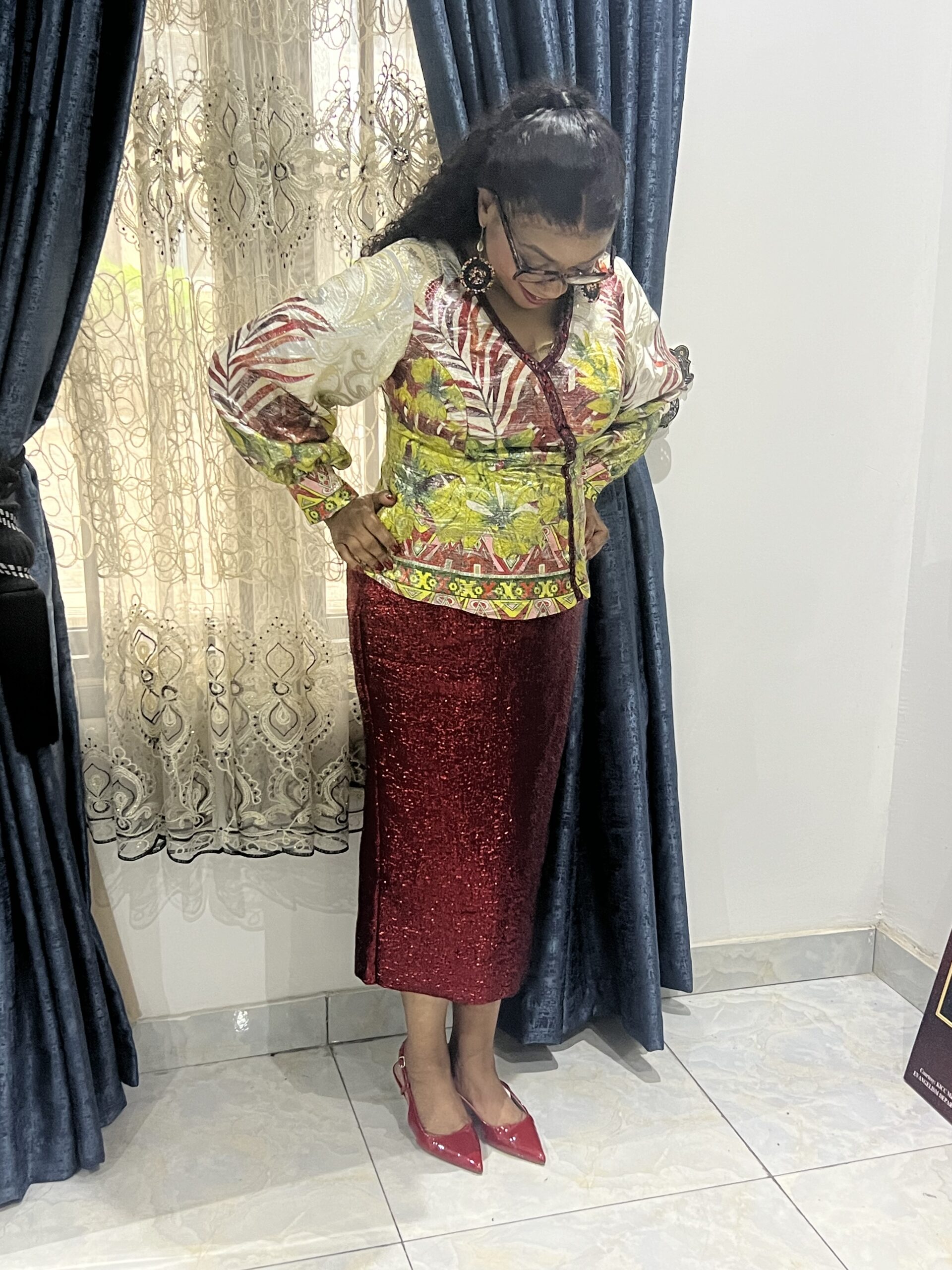 The Skirt: A striking high-waisted column skirt made from a deep crimson-red sequined or metallic fabric. The skirt hits at the mid-calf or ankle, providing a sleek, reflective contrast to the intricate print of the blouse.