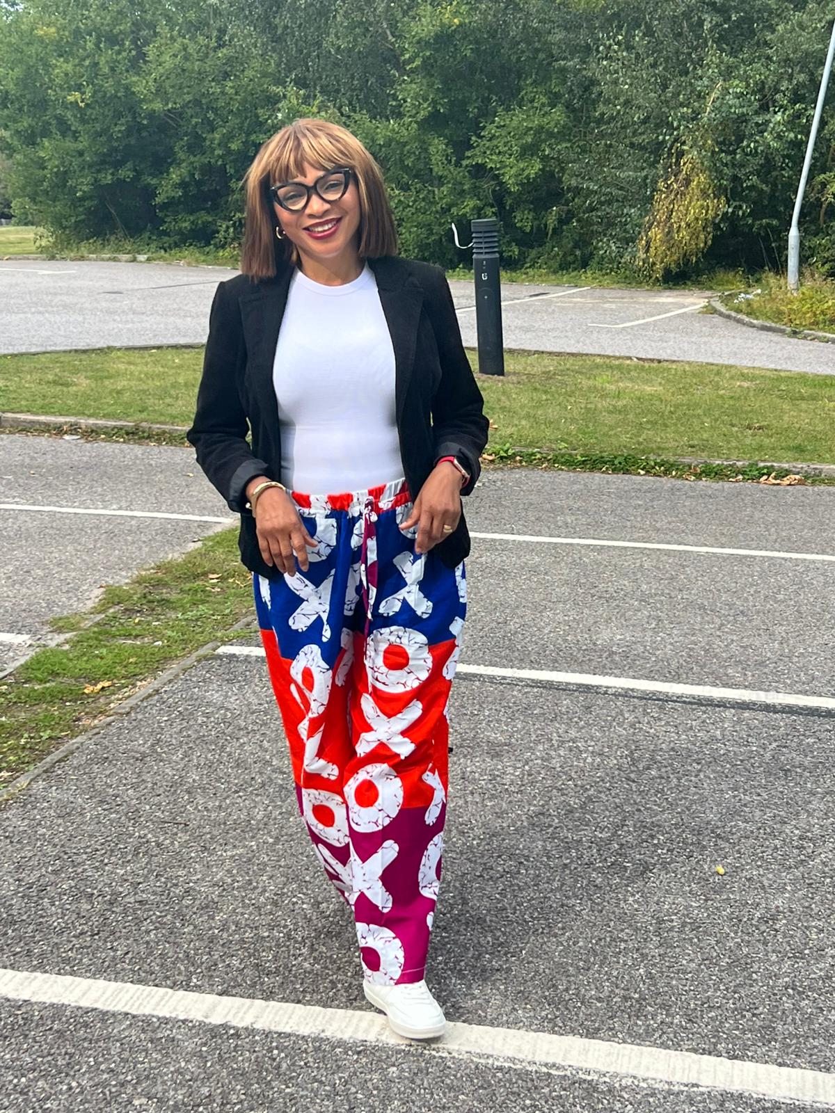The loose, flowing silhouette ensures maximum comfort and a flattering fit for all body types. Whether you’re dressing up for a special occasion or adding a pop of color to your everyday look, these pants are incredibly versatile. Pair them with a simple white top and a classic black blazer, as shown, to create a sophisticated yet casual ensemble that is both stylish and culturally rich.