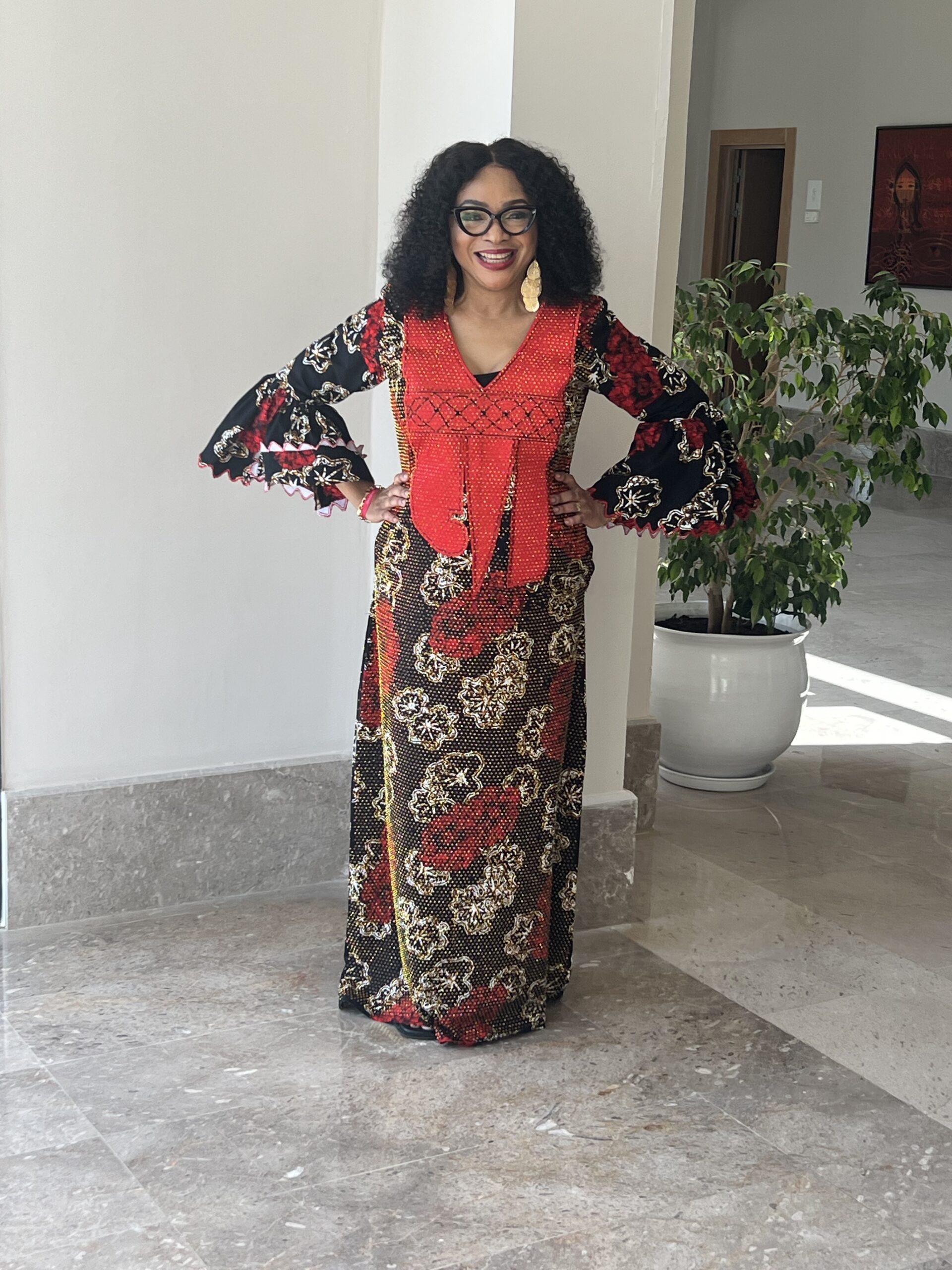The Fabric & Pattern: The main body of the gown is crafted from a dark, ornate fabric—likely a high-quality Ankara or Dutch wax print. It features a complex floral motif with large crimson-red roses and intricate gold filigree outlines set against a deep black base.