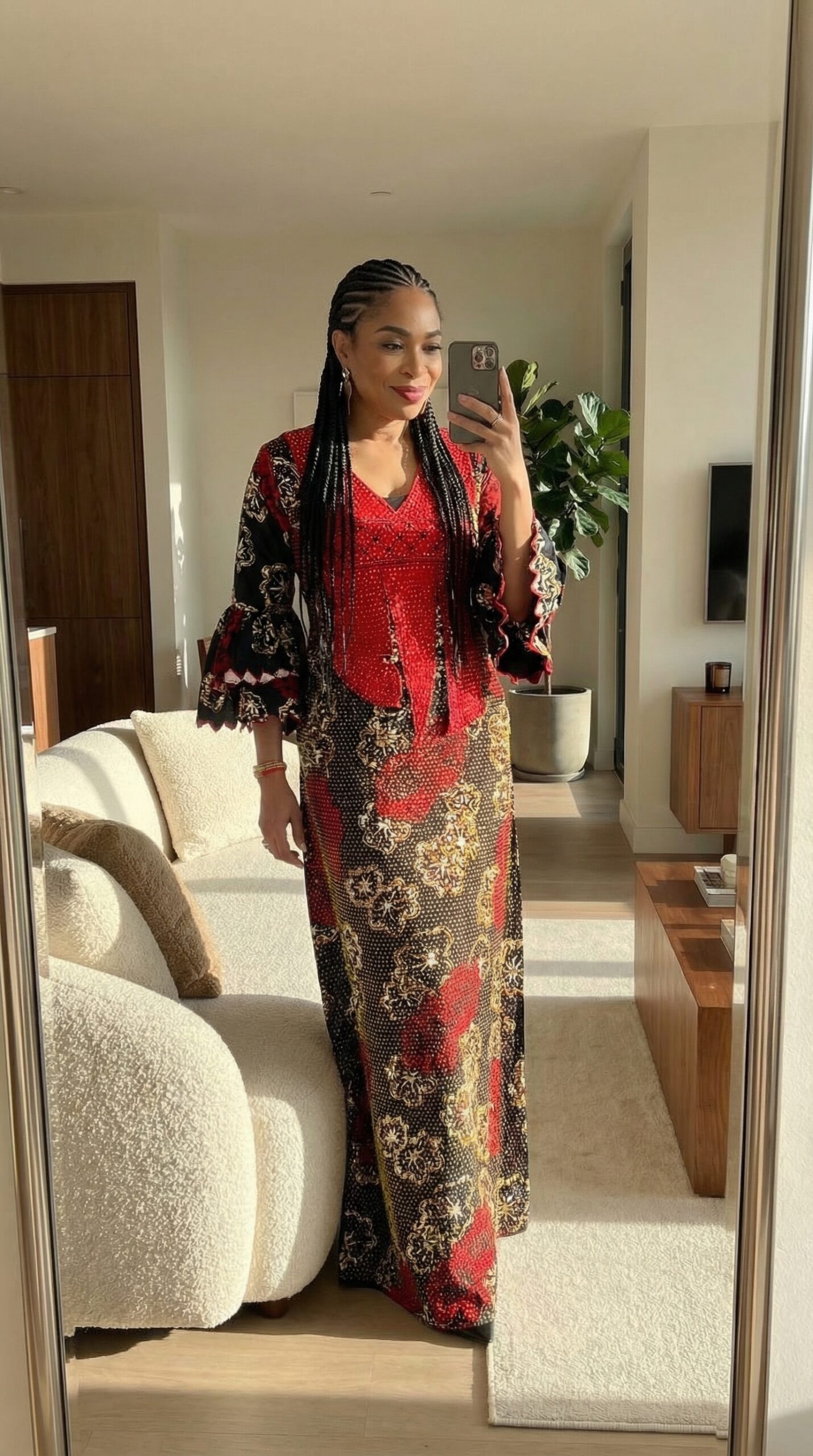 The Sleeves: The gown boasts dramatic bell sleeves that flare out widely from the elbow. The cuffs are finished with delicate red pom-pom or bead trim, adding a playful yet sophisticated detail to the silhouette.