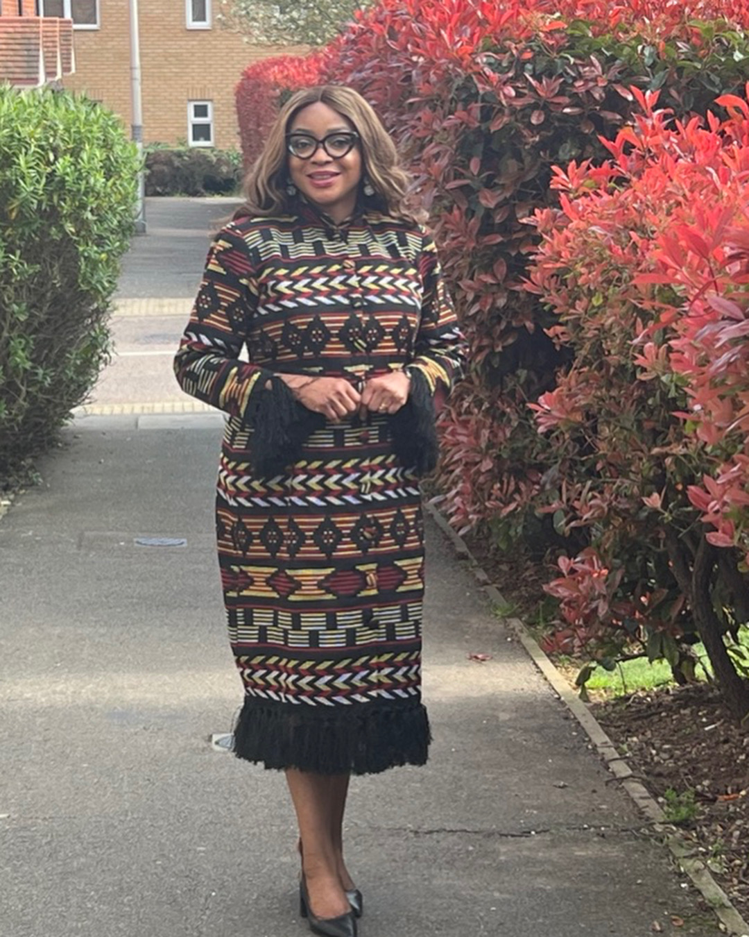• Pattern and Colors: The dress features a highly structured, geometric pattern arranged in horizontal bands. The design includes intricate zigzags, chevrons, and small rectangular blocks. The color palette is rich and earthy, consisting primarily of black, cream, muted gold/yellow, and deep burgundy/red.